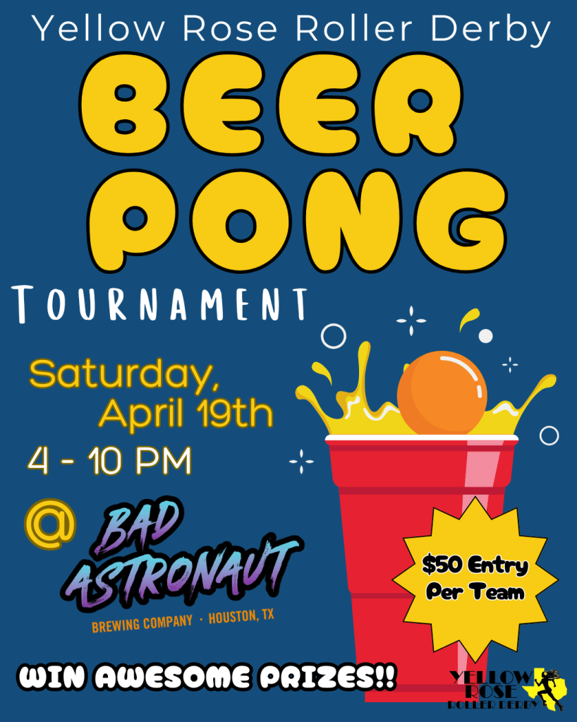 Think you’ve got what it takes to sink the perfect shot? Grab a partner and join Yellow Rose Roller Derby for our Beer Pong Tournament Fundraiser at Bad Astronaut Brewery on Saturday, April 19th!