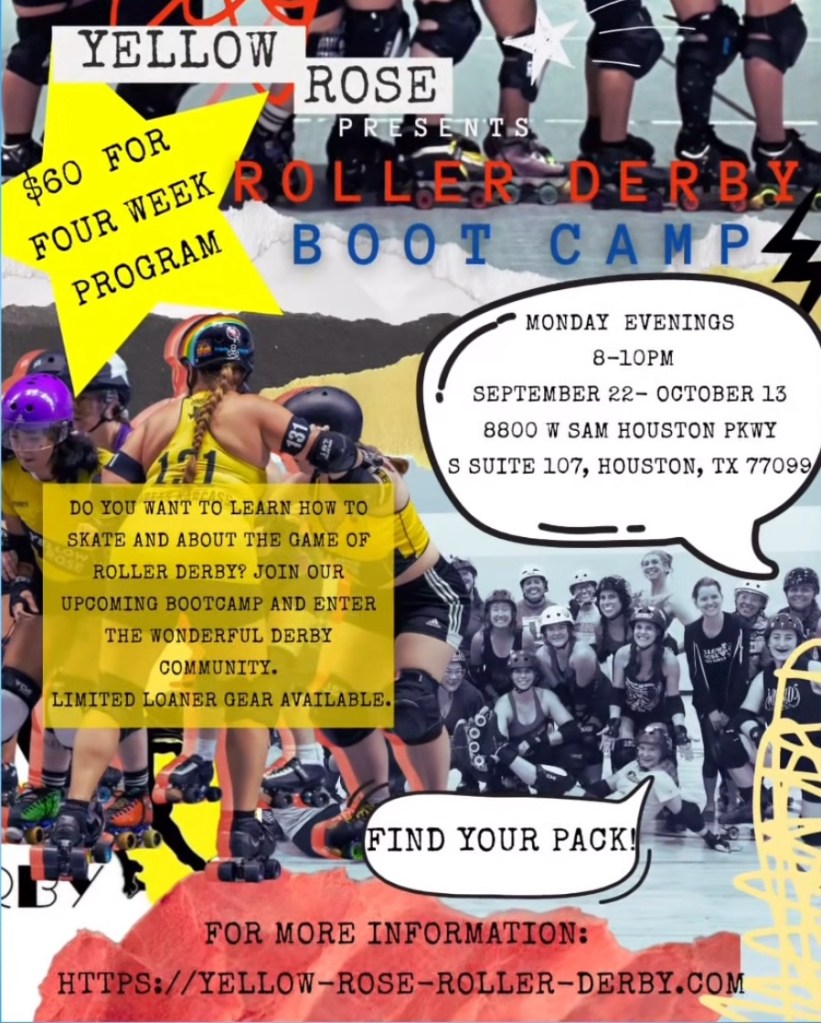 Yellow Rose Roller Derby it hosting a four-week flat track roller derby beginner’s boot camp. This beginner’s roller derby boot camp is a fun way to get in shape, make new friends, and hone your skating skills to play or referee the sport of roller derby!